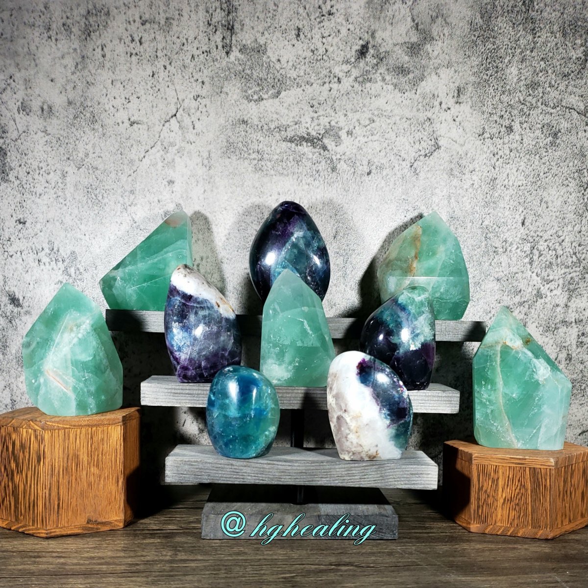 Fluorite, Anhydrite, Labradorite, Green Opal, Coral / Blossom Agate, Lepidolite, Septarian